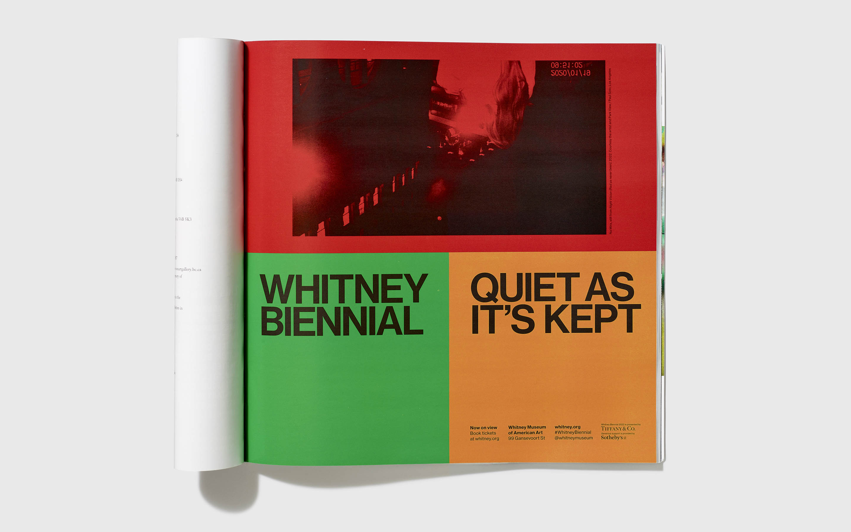 Identity and campaign for the 80th edition of the foremost survey of American art. Building on the 2019 Biennial’s wordmark and color-forward approach, we developed a bisecting space-division system and motion pattern that could ingest Biennial artworks, in-gallery photography, videos, or just text and output an array of distinct impressions, all generating a comprehensive picture of the exhibition.