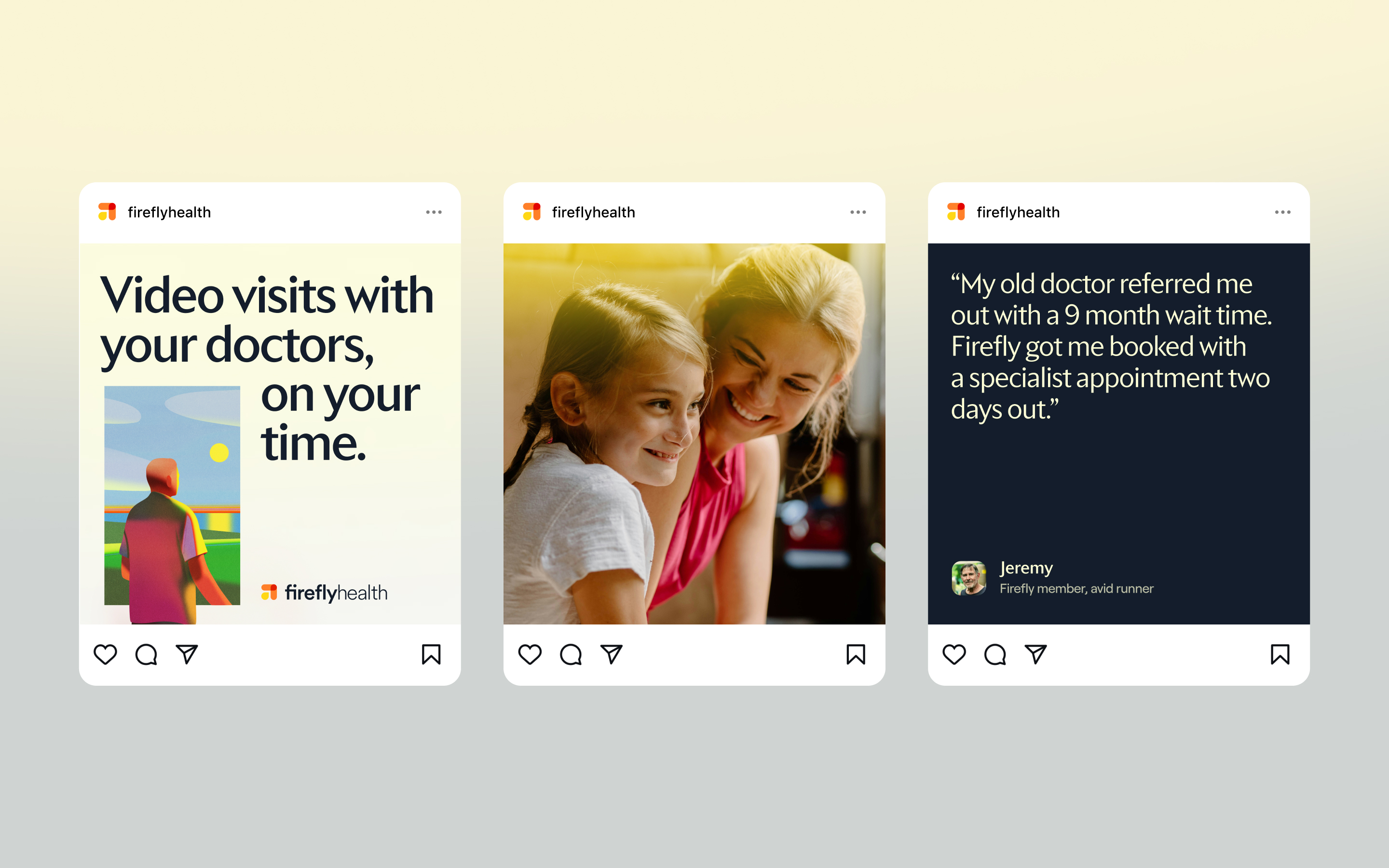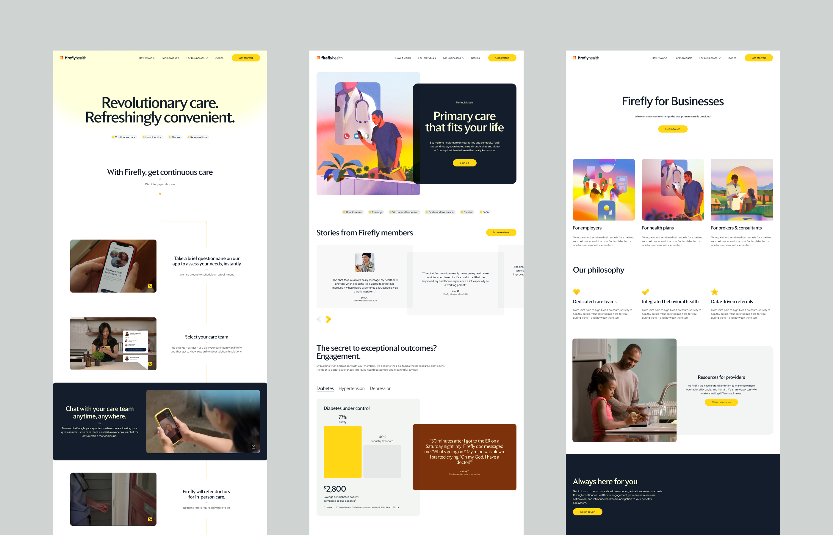 An evolution of Firefly Health's brand strategy, visual identity, and website. I led a creative team to create a warm, new typographic and color palette, commission illustration, and build out a flexible web design system that allows content editors to speak to all of Firefly's audiences – patients, providers and partners alike.