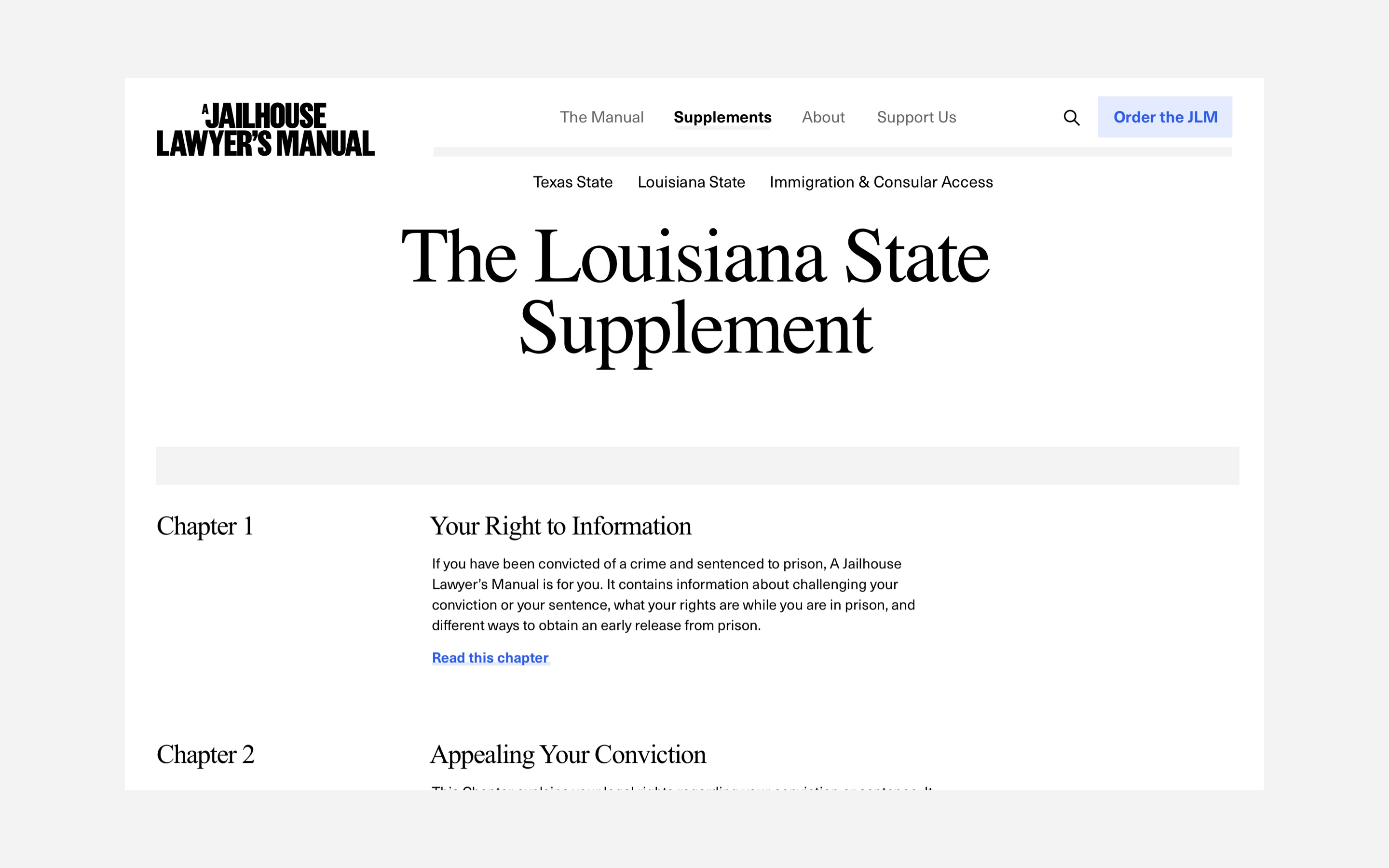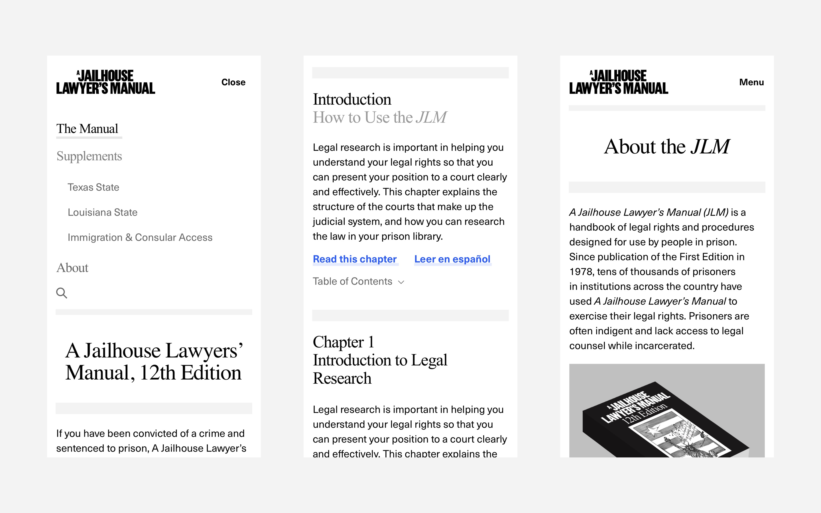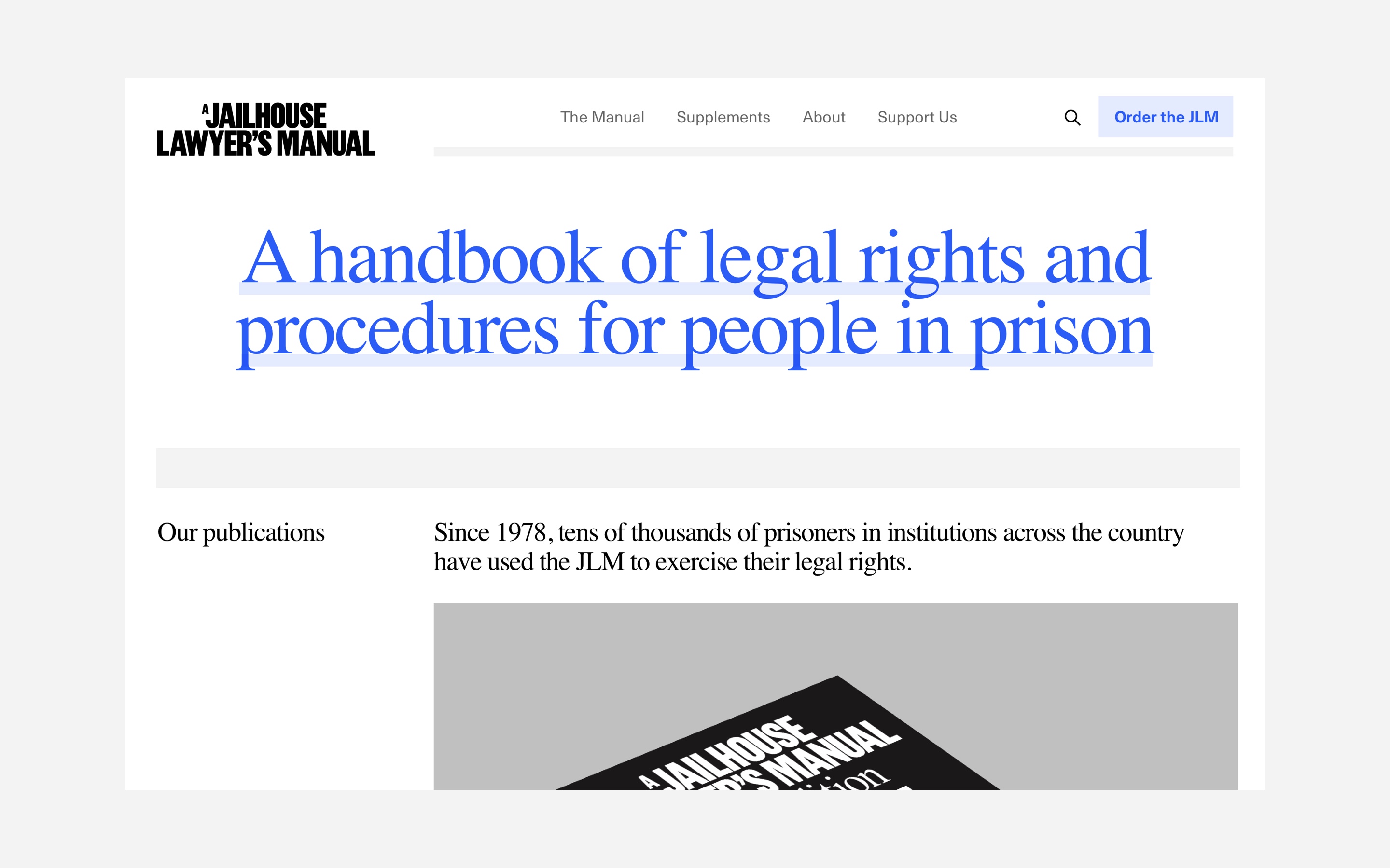 Web, identity, and print work with the Jailhouse Lawyer's Manual. The JLM is a free publication and resource for incarerated people with no legal background to better understand how to legally represent themselves or others. A simple, organized website allows outside contacts and loved ones to contribute to research.