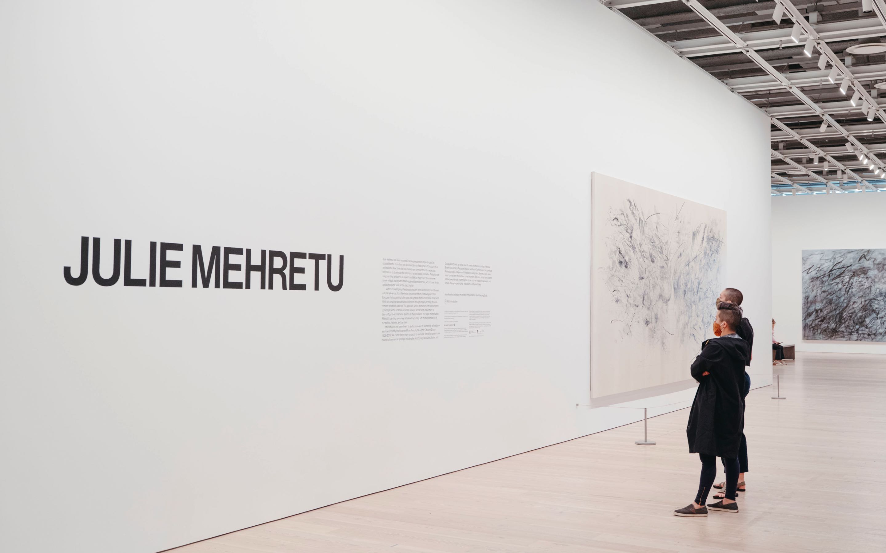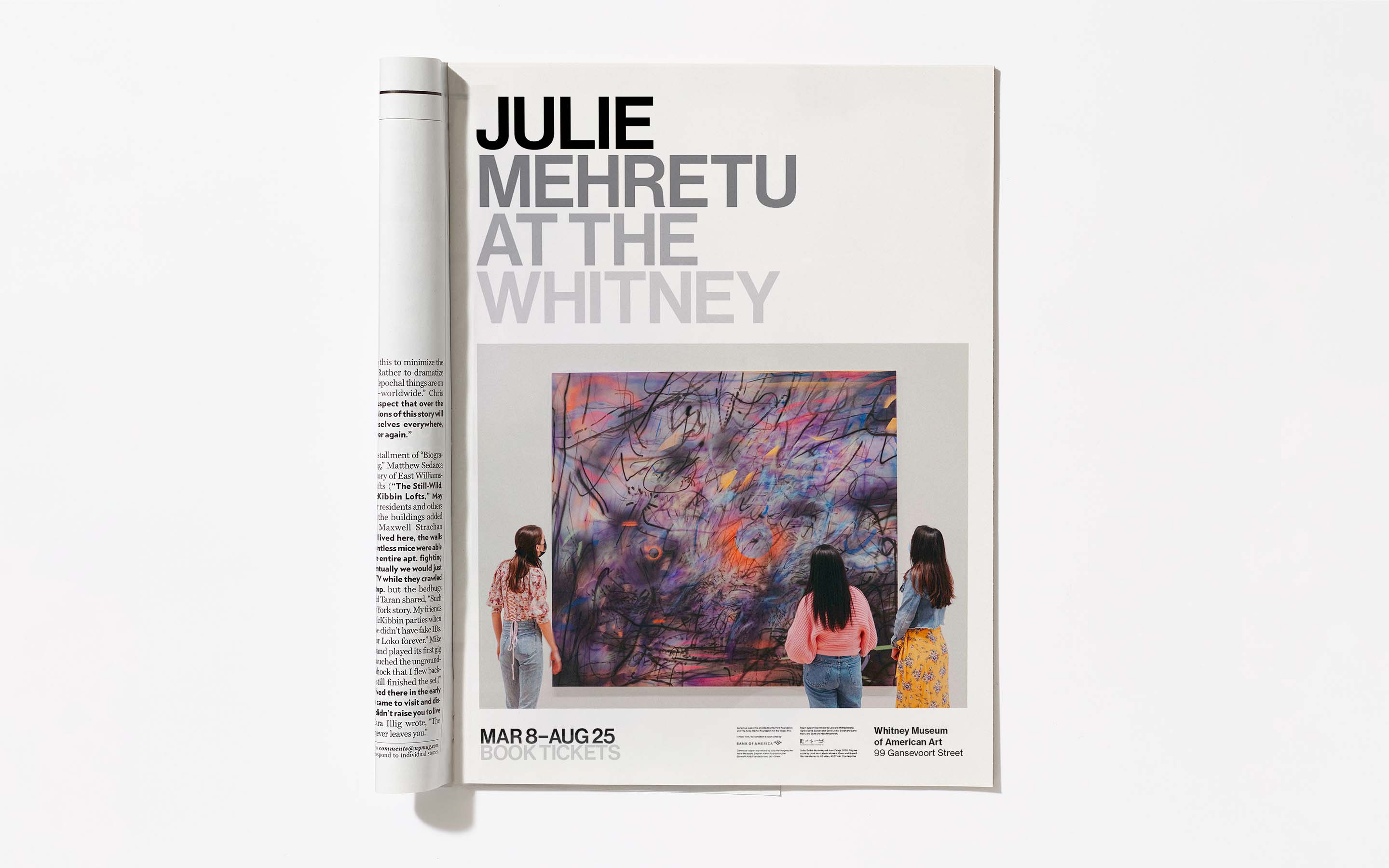 Exhibition graphics and campaign design direction for a survey of Julie Mehretu’s decades-long career. We developed a design language employing a gradiated, tonal approach to typography, drawing from Edouard Glissant’s writings on the “right to opacity,” which form a core influence in Mehretu’s work.