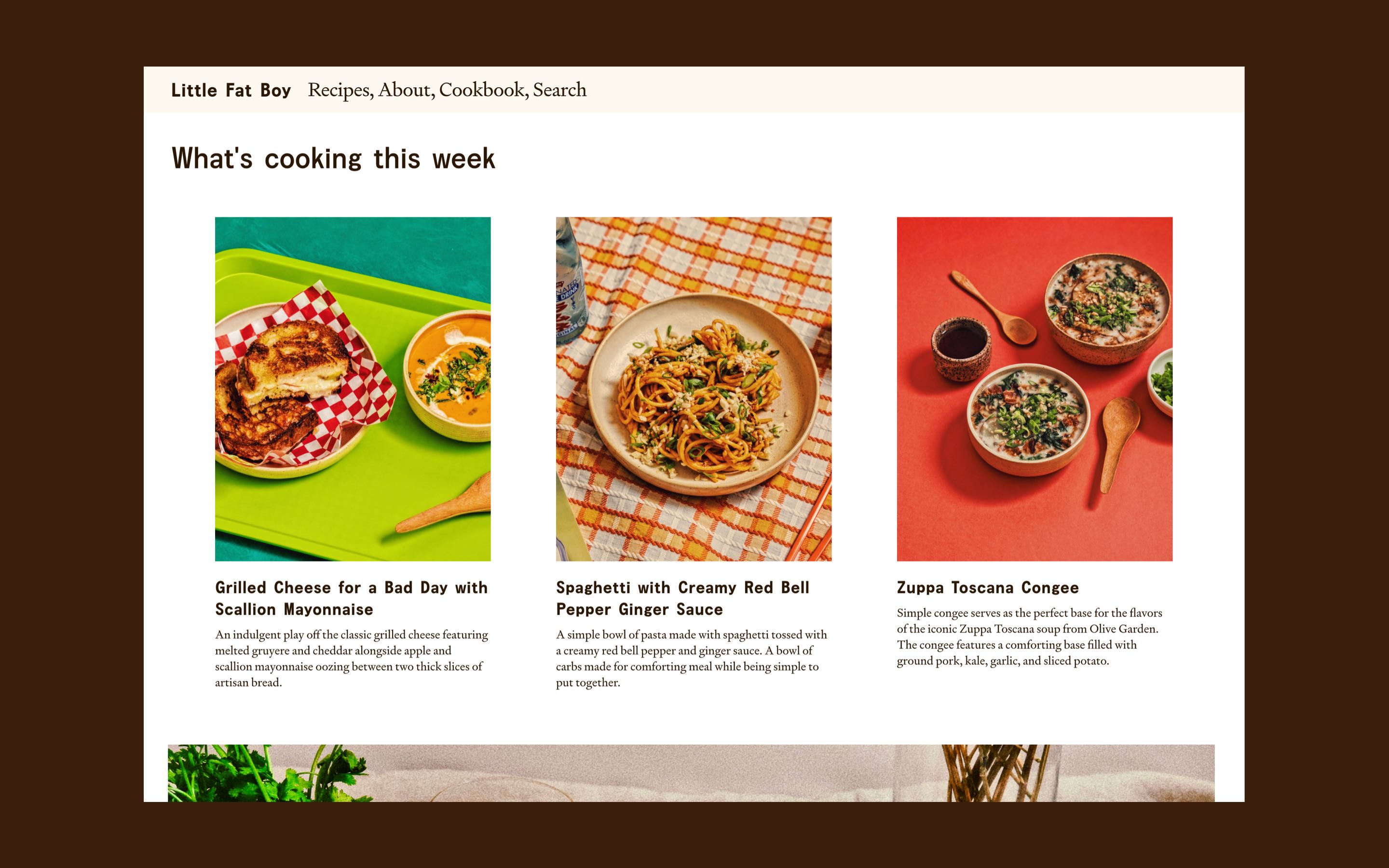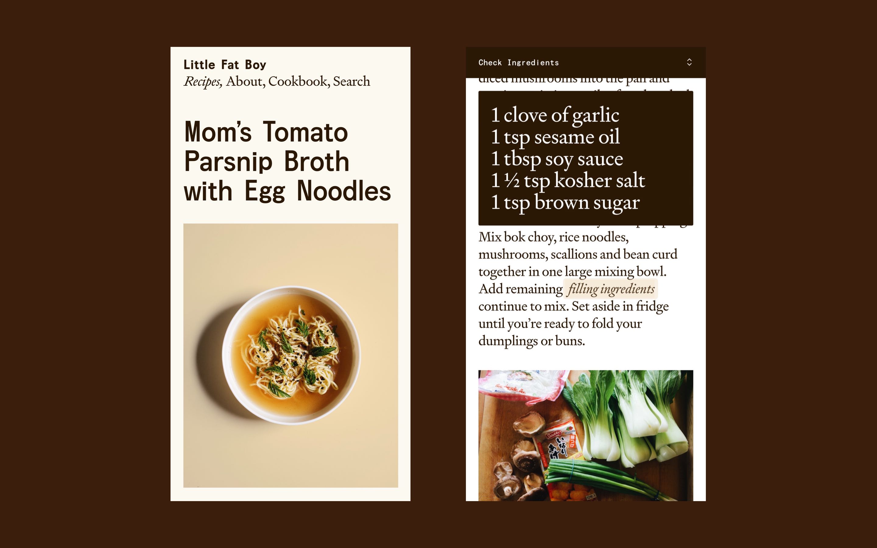 Web design and development for infectiously wholesome food personality Frankie Gaw, as a platform for his growing universe of recipes, stories, cookbooks, and more from a distinct Asian American perspective. The site balances a simple design language with traces of human touch to match Frankie’s casual personality and polished visual sensibilities. The site is a 2024 Webby Award winner.