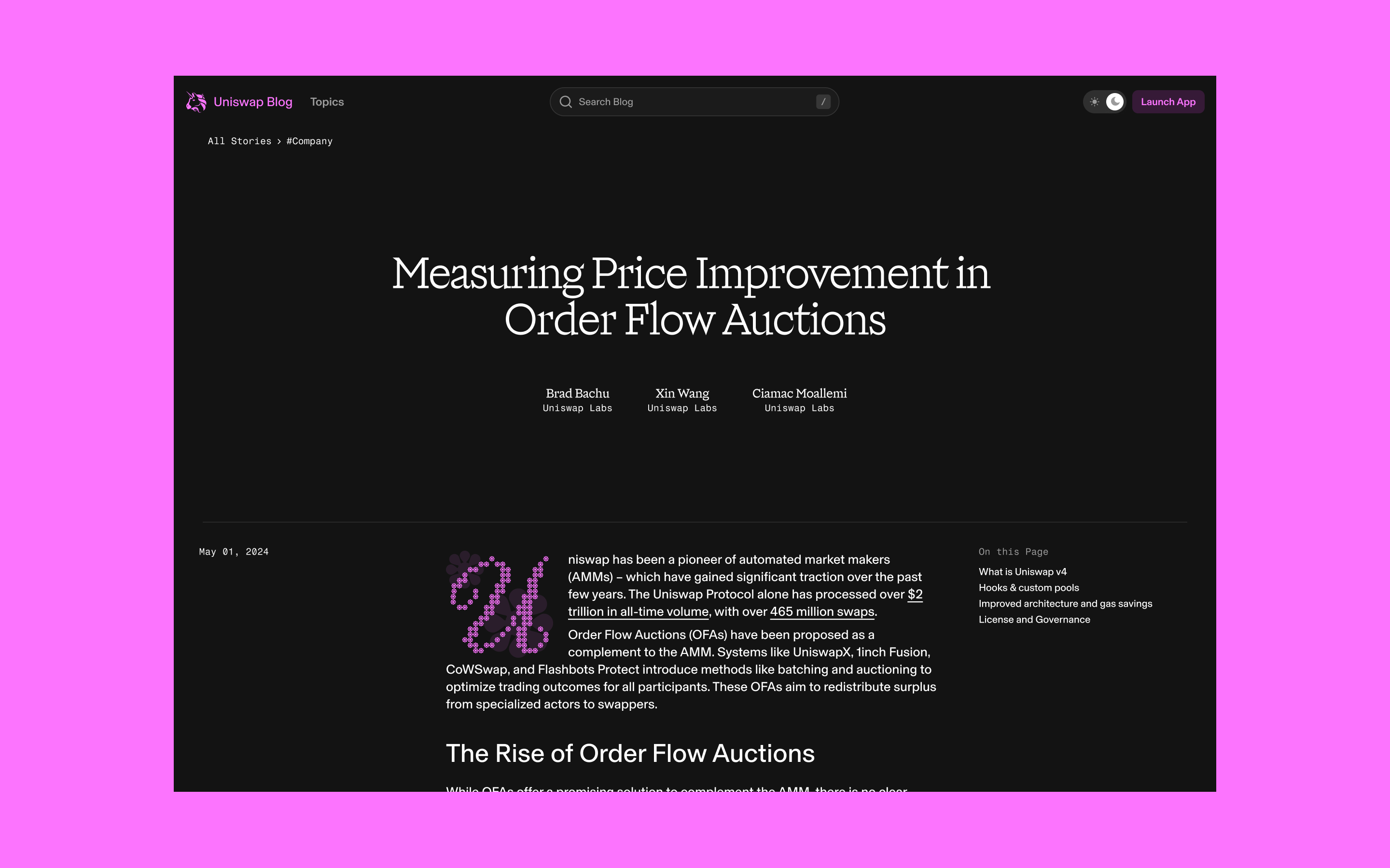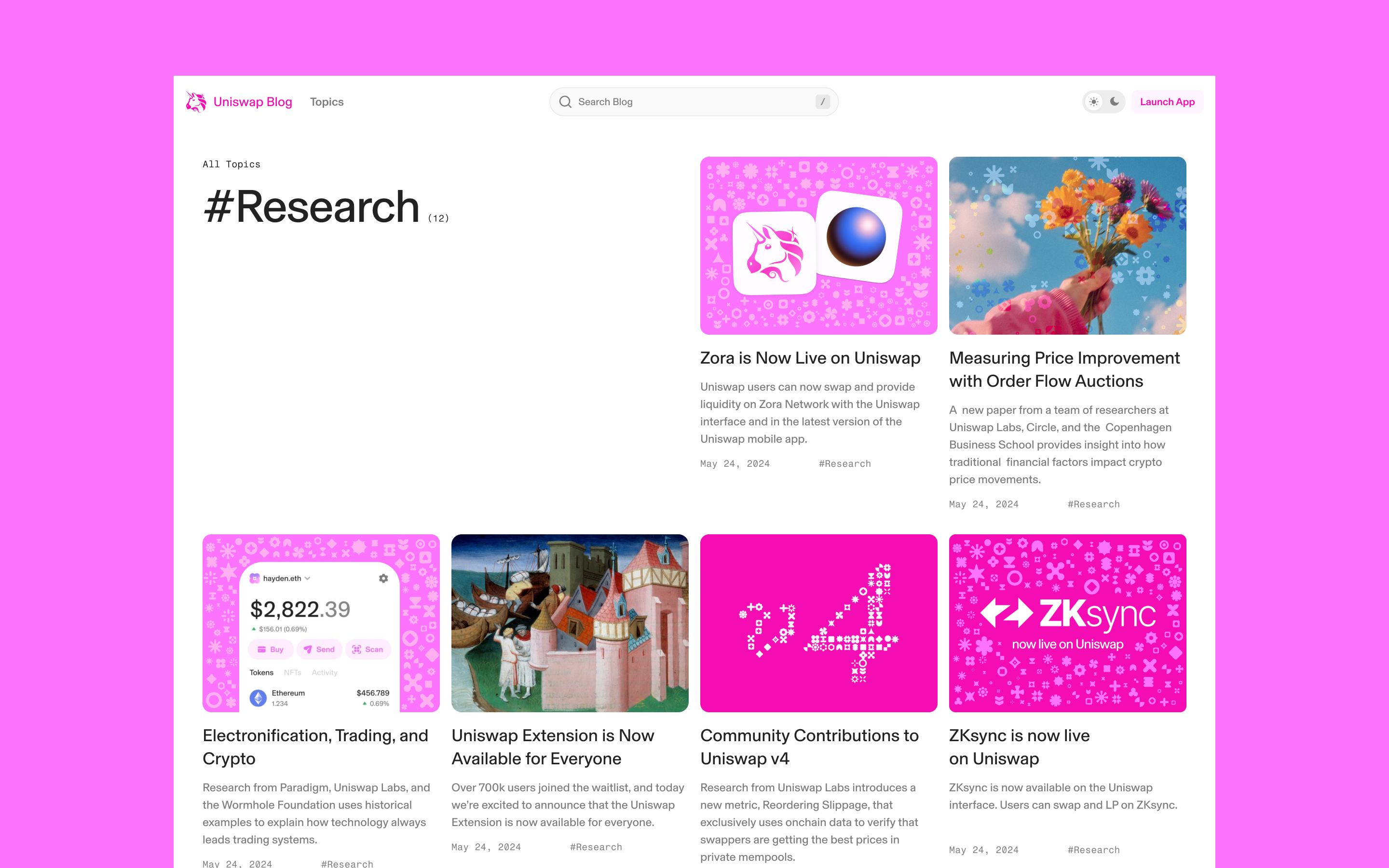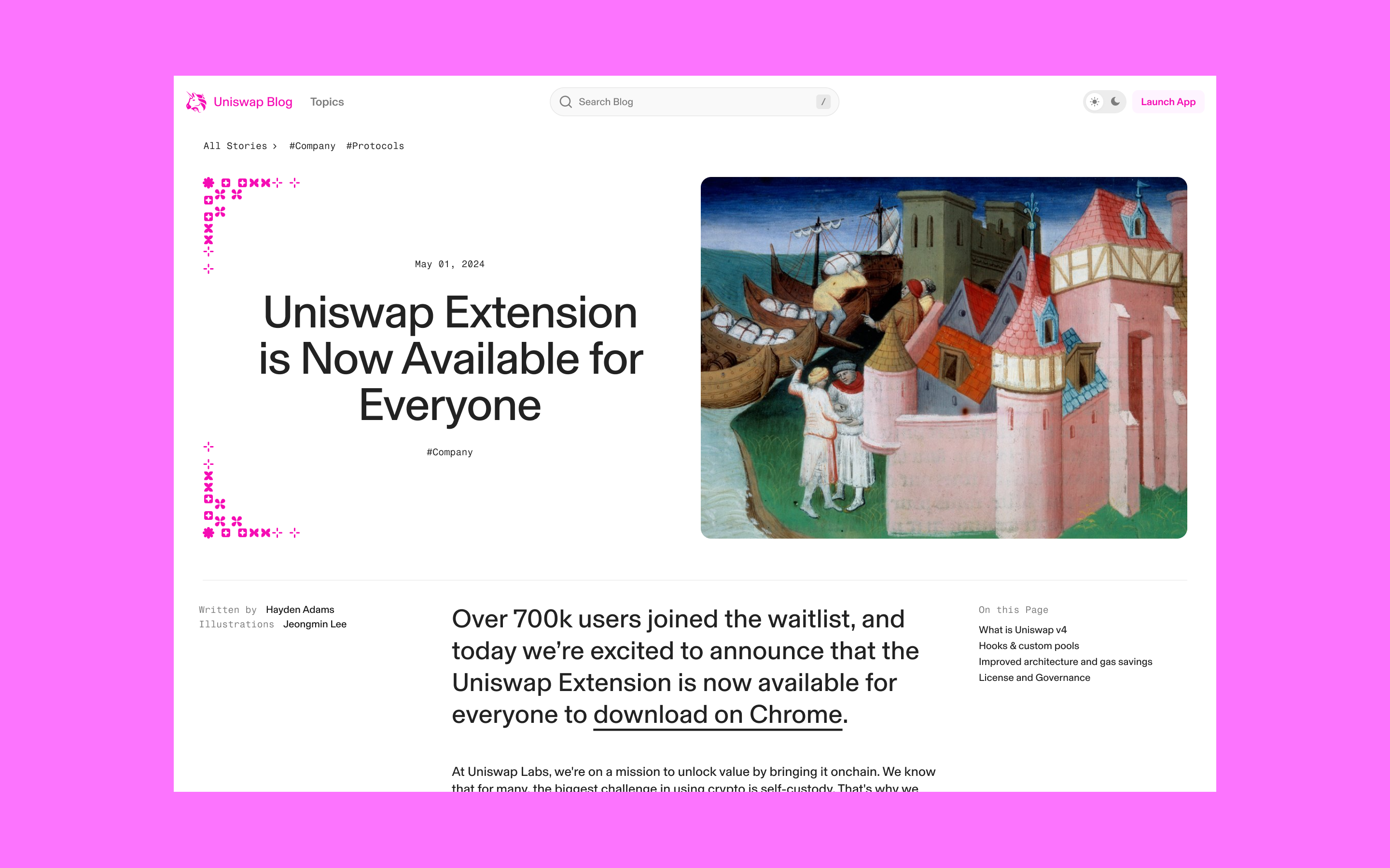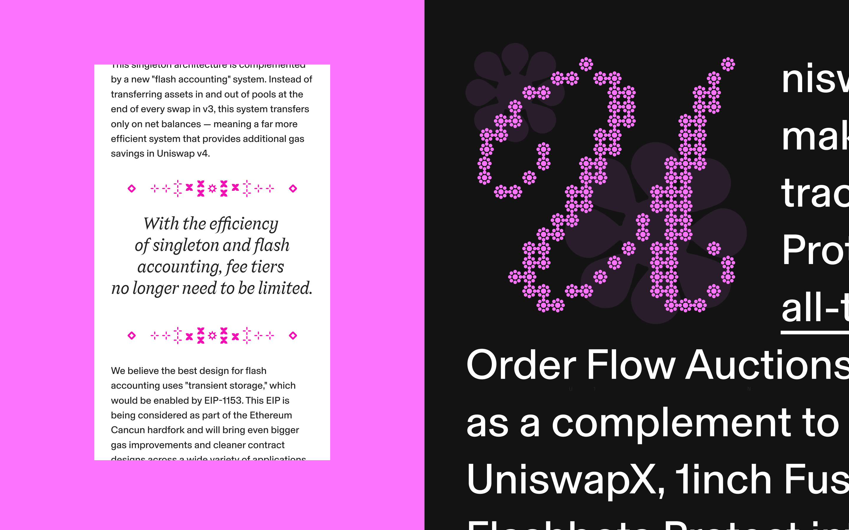 Through a project with Uniswap designing and building the blog and support functions of their website, we worked closely with the internal brand team to clarify and expand the brand’s visual language of Uniswap and the use of their icon palette, drawing inspiration from medieval mille-fleur tapestries and illuminated manuscripts. These principles worked their way into image asset art direction, and a broader update to their component and type systems.