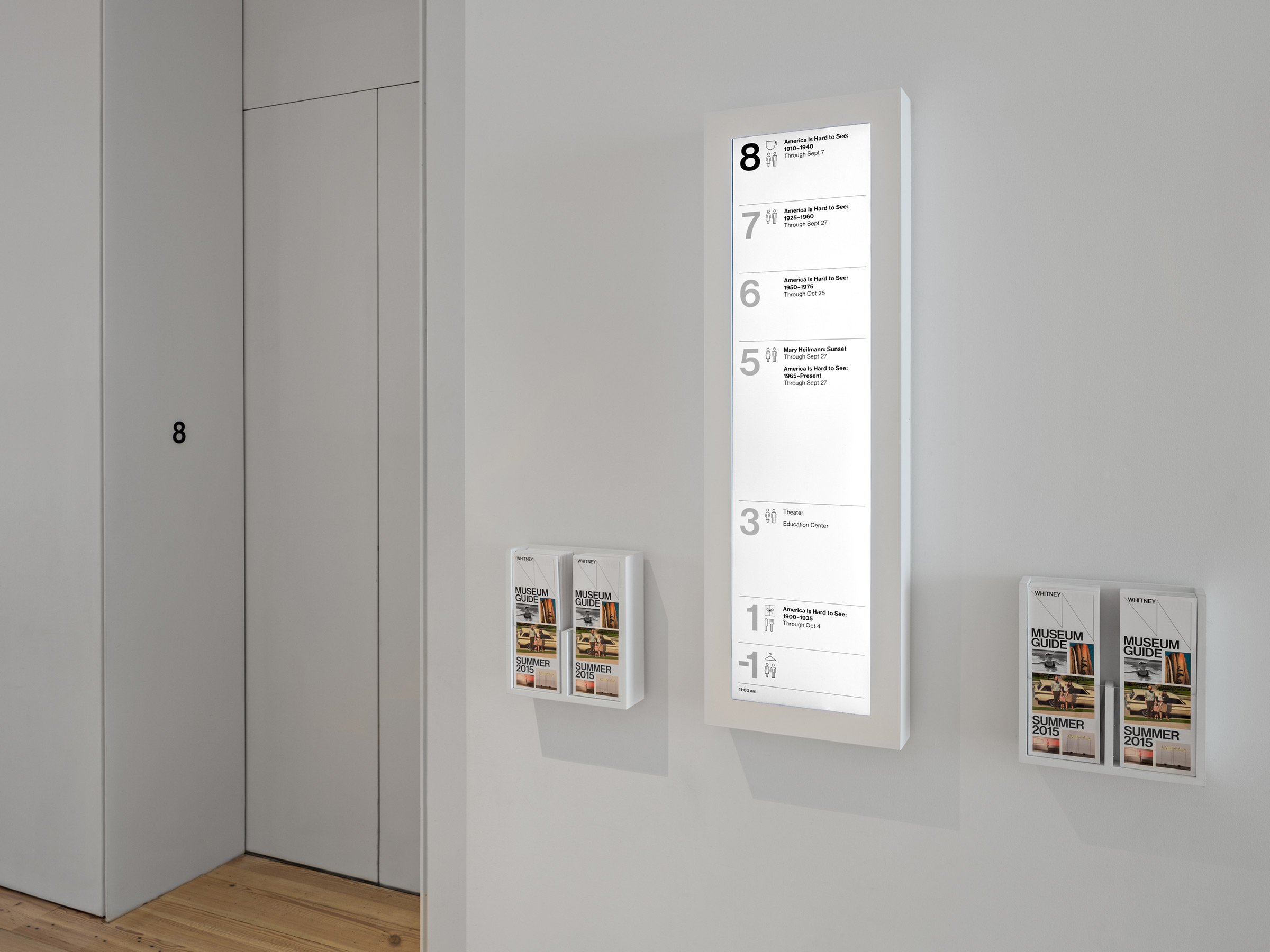 I designed wayfinding systems within the walls of the Whitney, particularly for digital, real-time displays showing live data of the day's exhibitions and events.