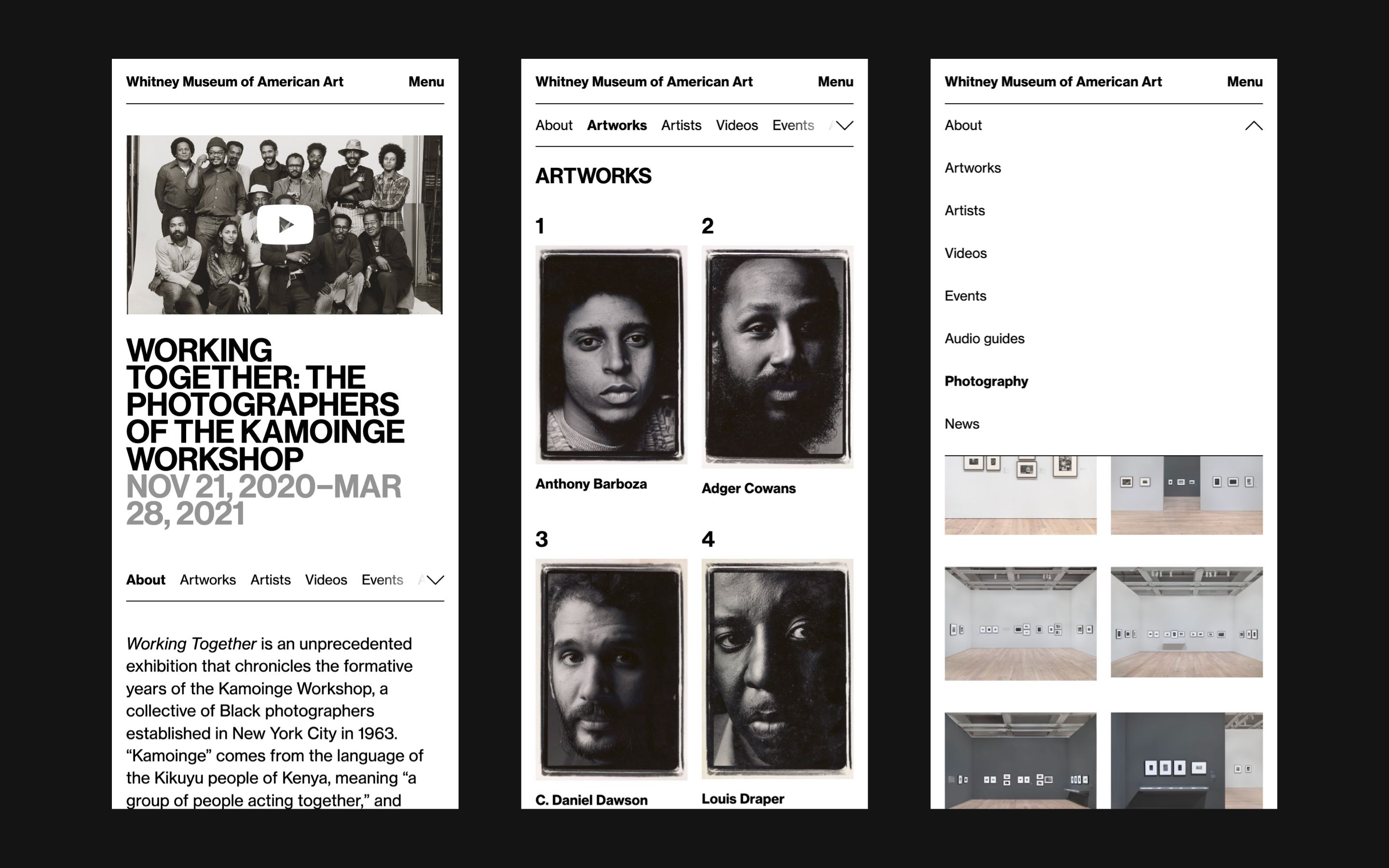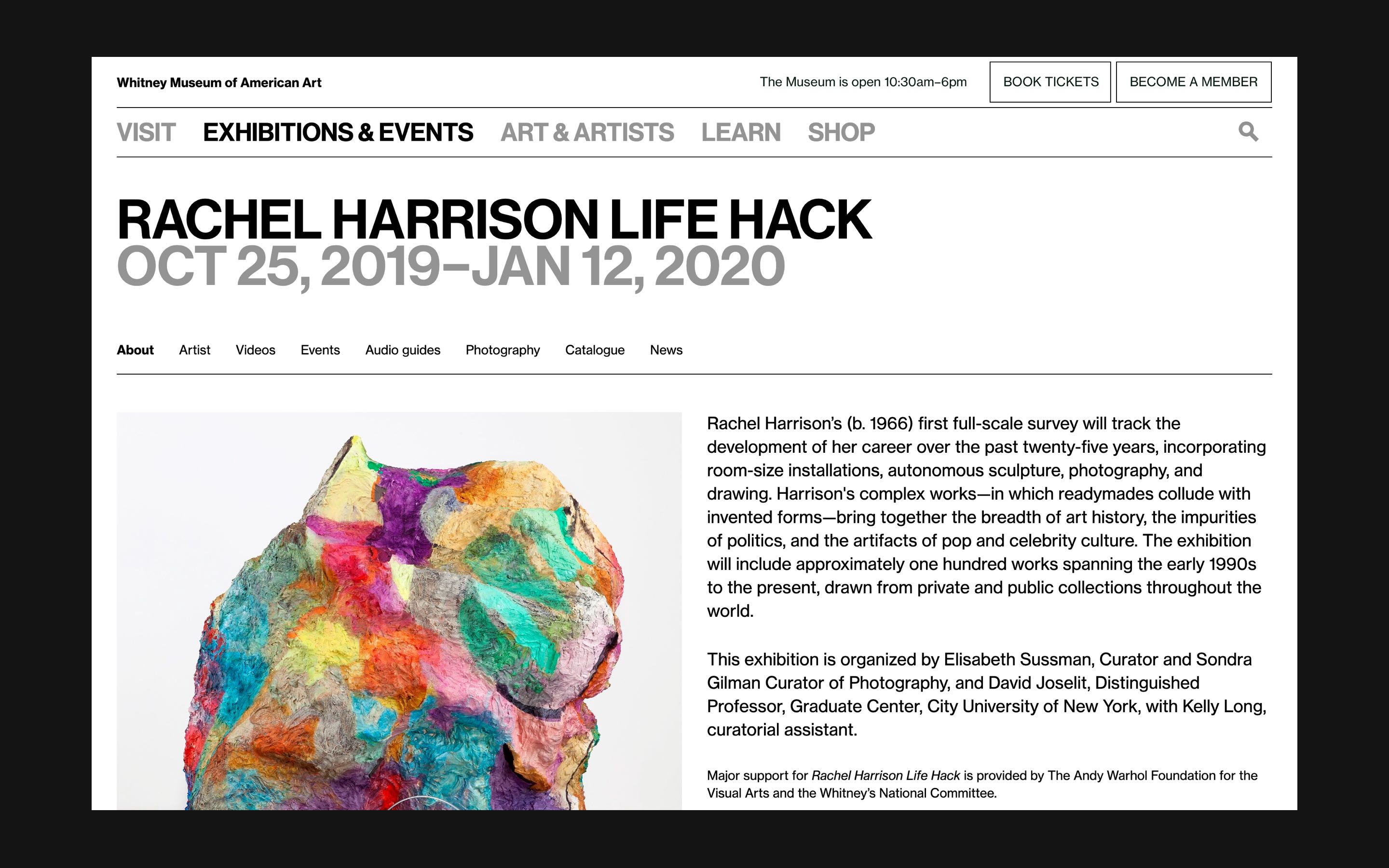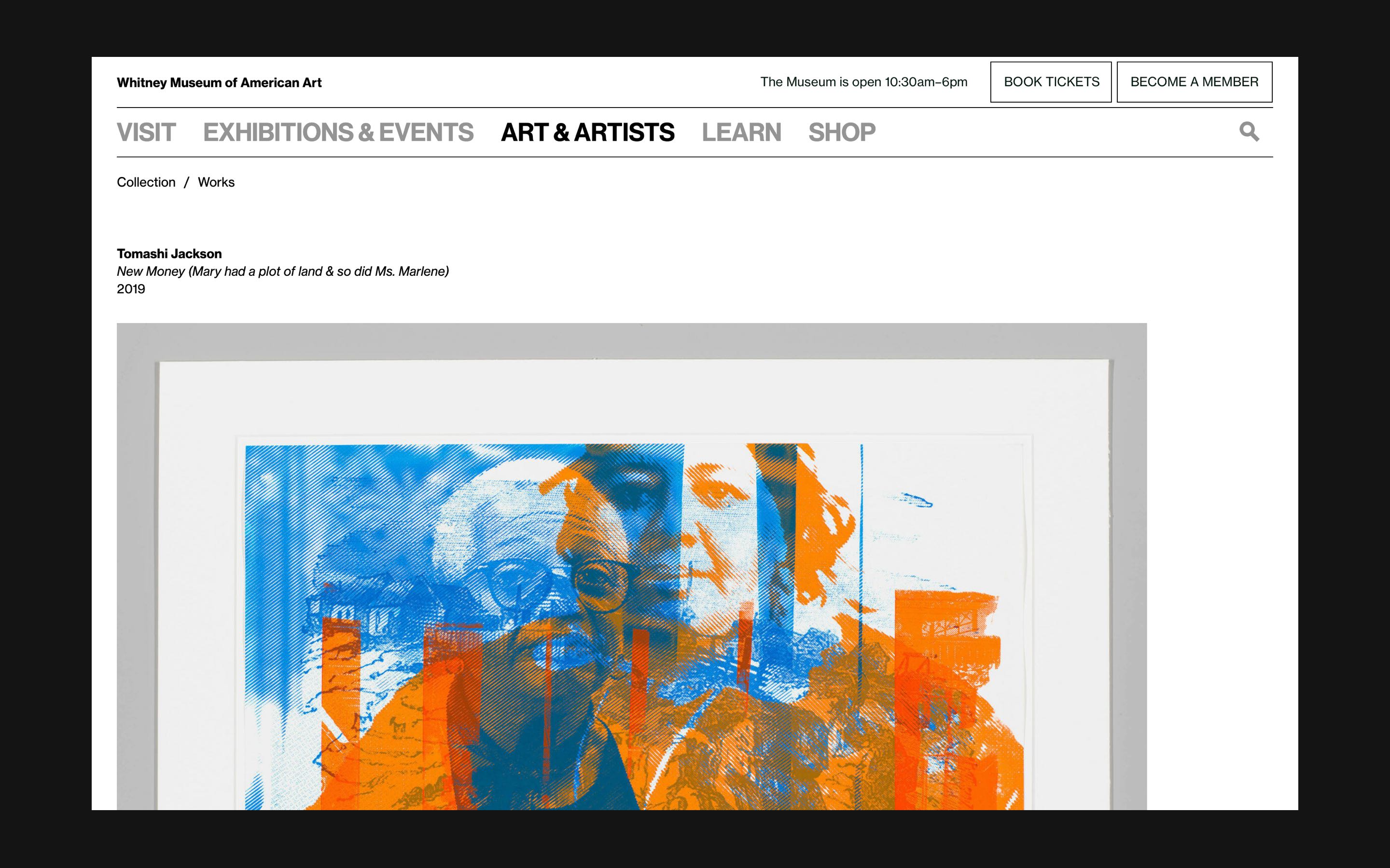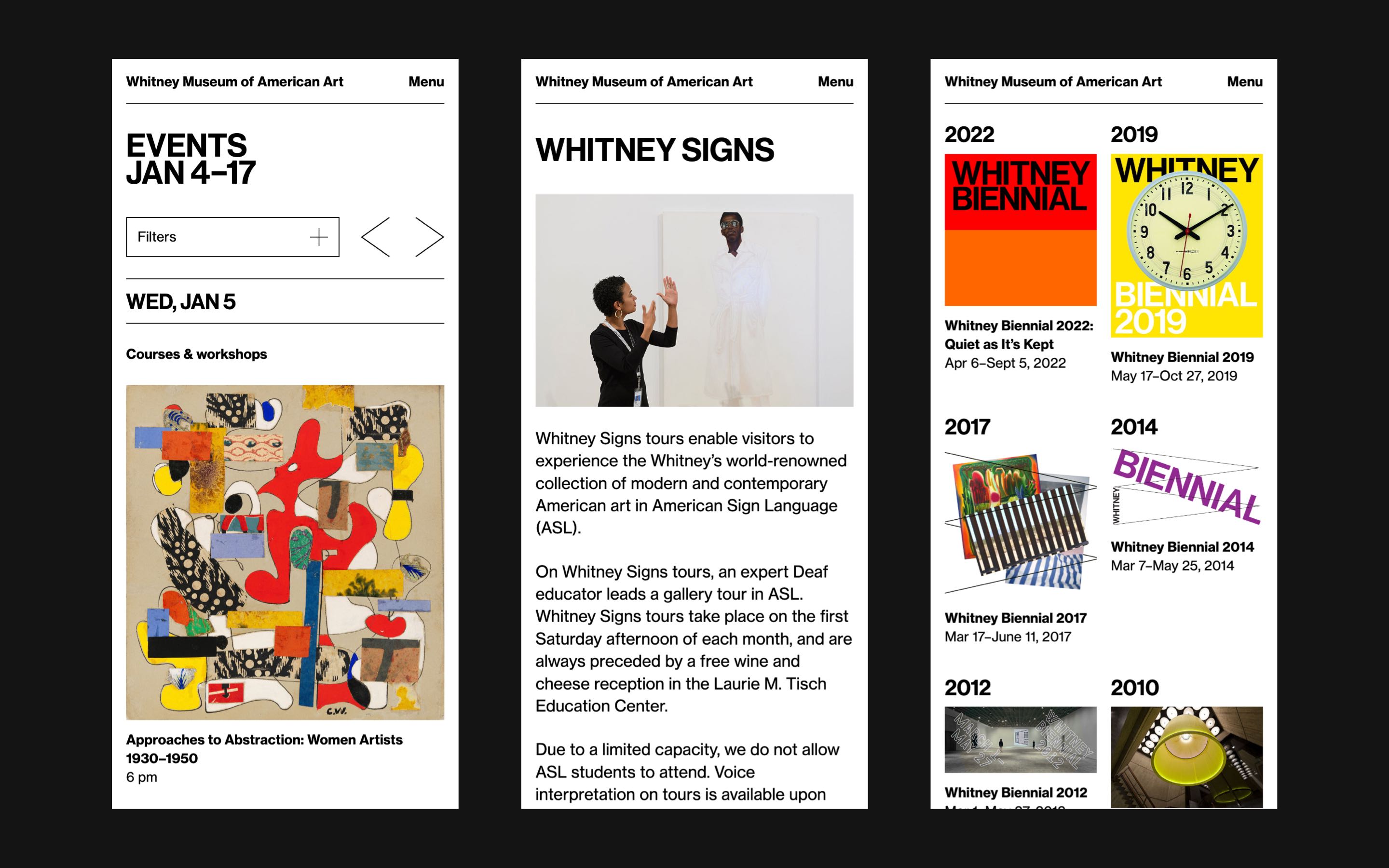 Design for the Whitney's website and Mobile Guide. From 2019–2022, I created, maintained, documented and advocated for the Whitney digital design system, including a site-wide overhaul of typographic scale and spacing rules; worked with web developers on accurate implementation; established layout best practices that gave content managers guidance to construct page layouts in the CMS; and promoted visual, keyboard and touch accessibility across all aspects of the website.