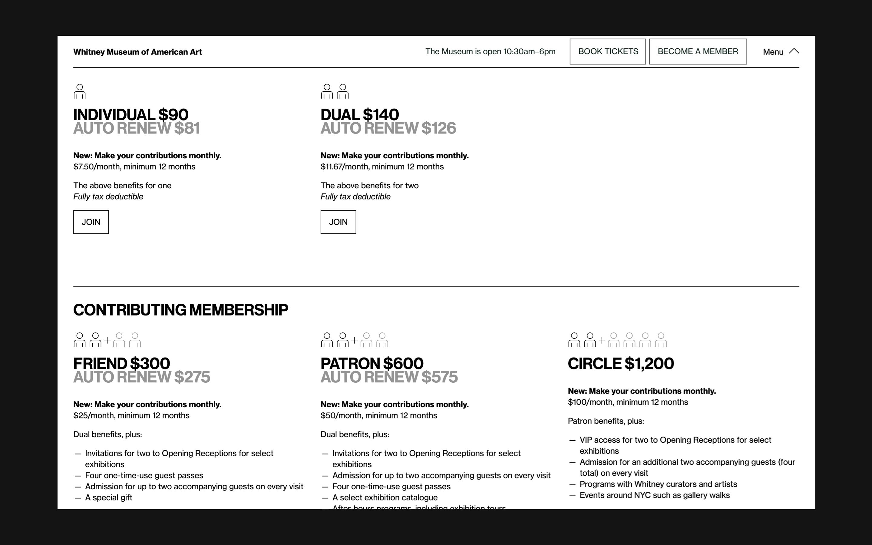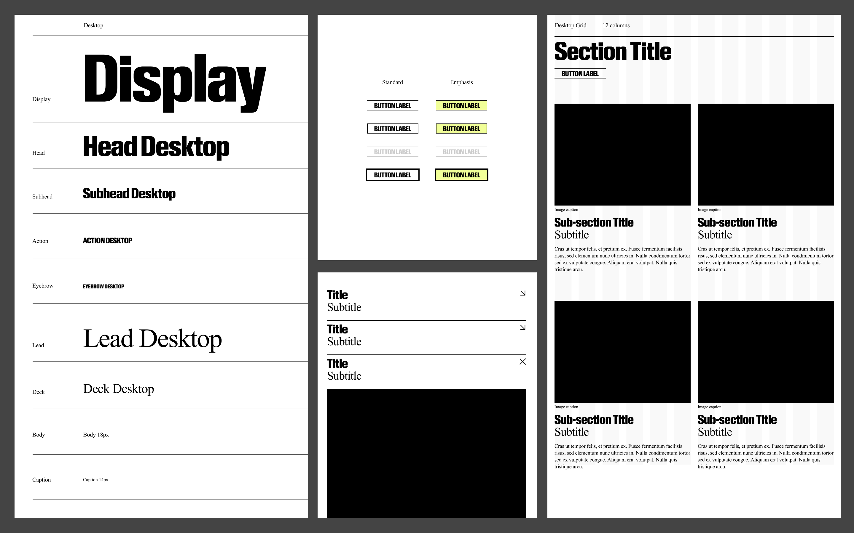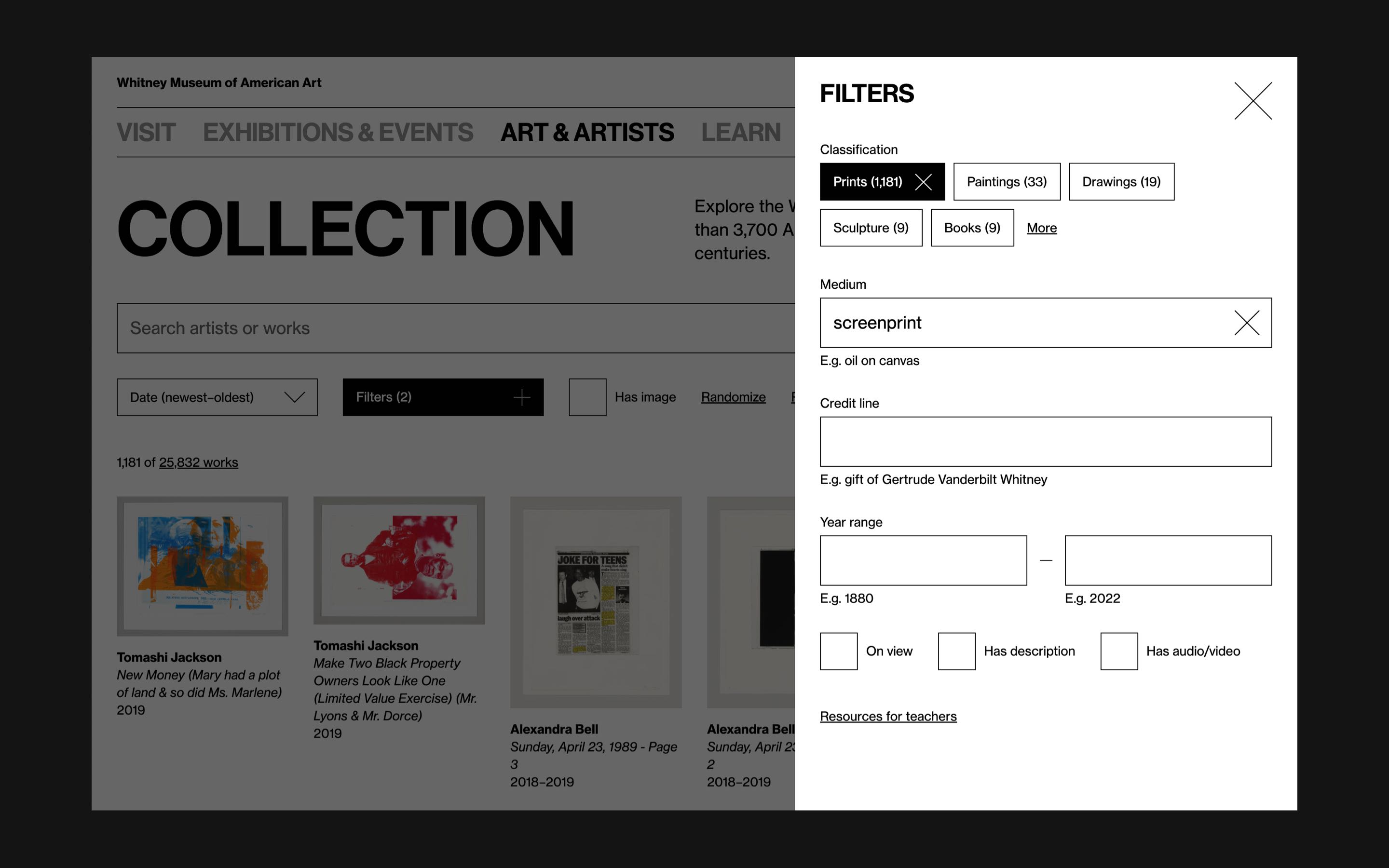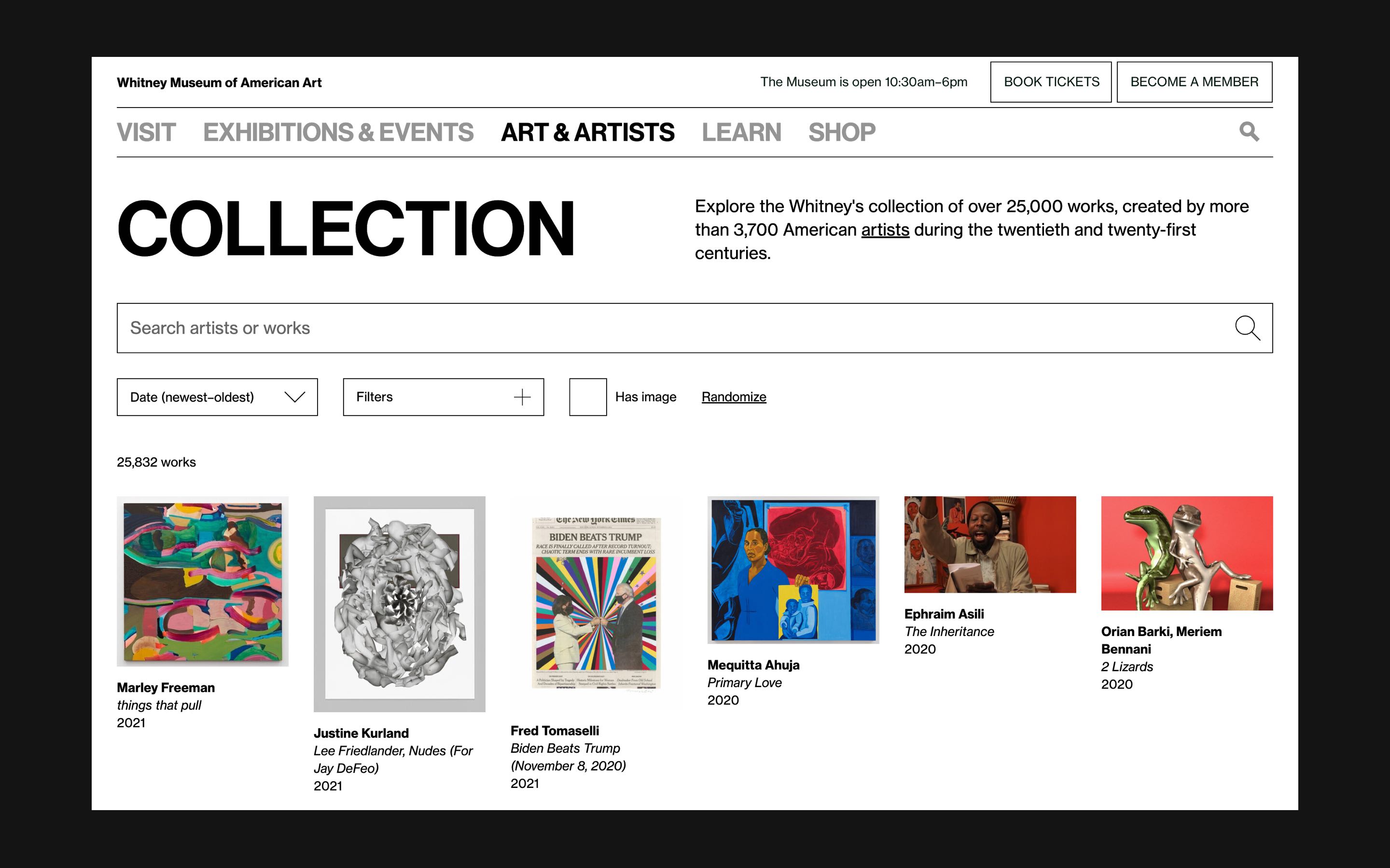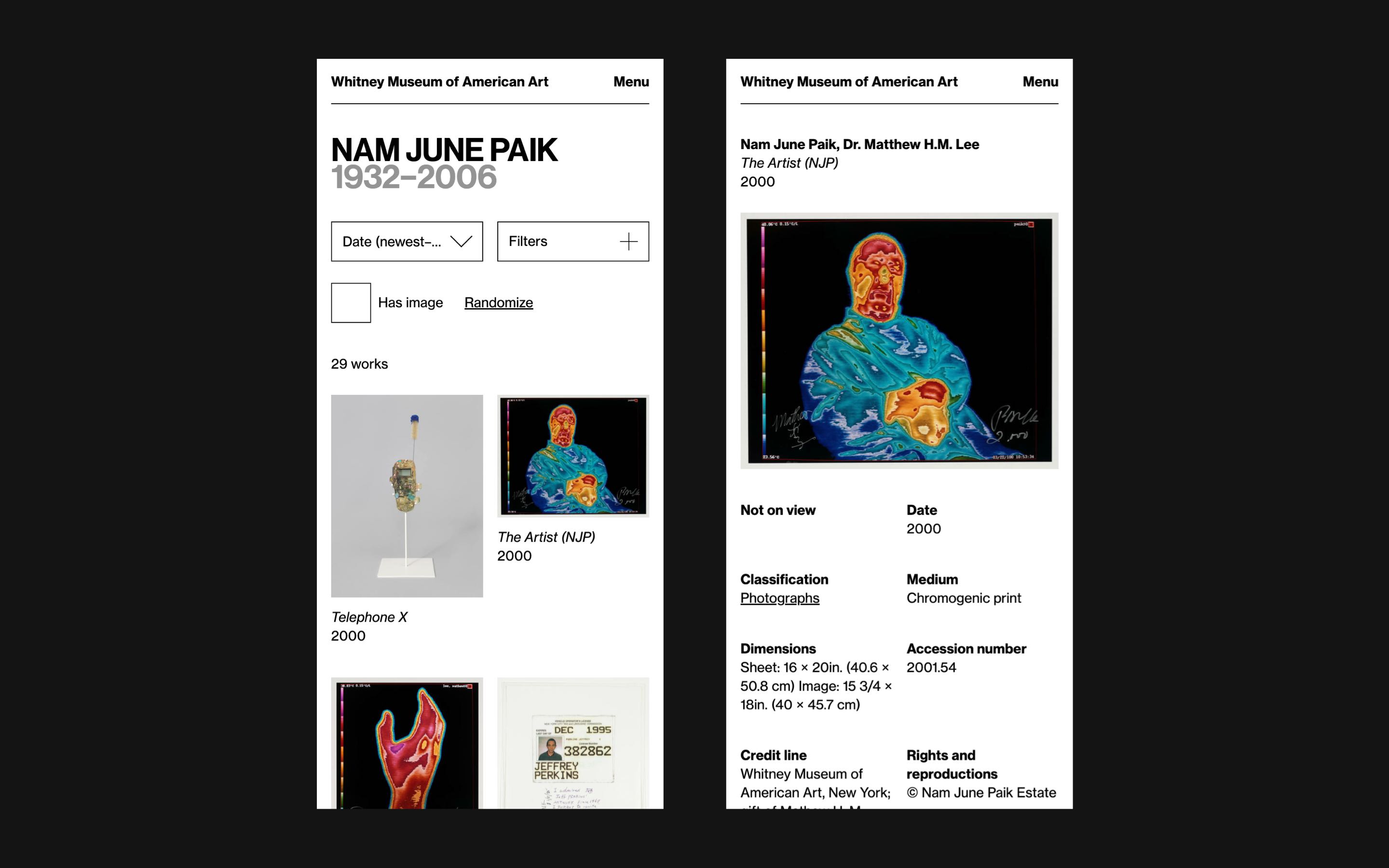 Design for the Whitney's website and Mobile Guide. From 2019–2022, I created, maintained, documented and advocated for the Whitney digital design system, including a site-wide overhaul of typographic scale and spacing rules; worked with web developers on accurate implementation; established layout best practices that gave content managers guidance to construct page layouts in the CMS; and promoted visual, keyboard and touch accessibility across all aspects of the website.